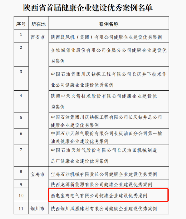 近日,Good news在陜西省衛(wèi)健委組織開展的健康企業(yè)建設(shè)優(yōu)秀案例征集活動中,西電寶雞電氣脫穎而出,成功入選陜西省首屆健康企業(yè)建設(shè)優(yōu)秀案例名單。這一榮譽不僅是對企業(yè)以人為本、關(guān)愛員工健康理念的高度認可,更為省內(nèi)企業(yè)健康建設(shè)樹立了示范標桿。