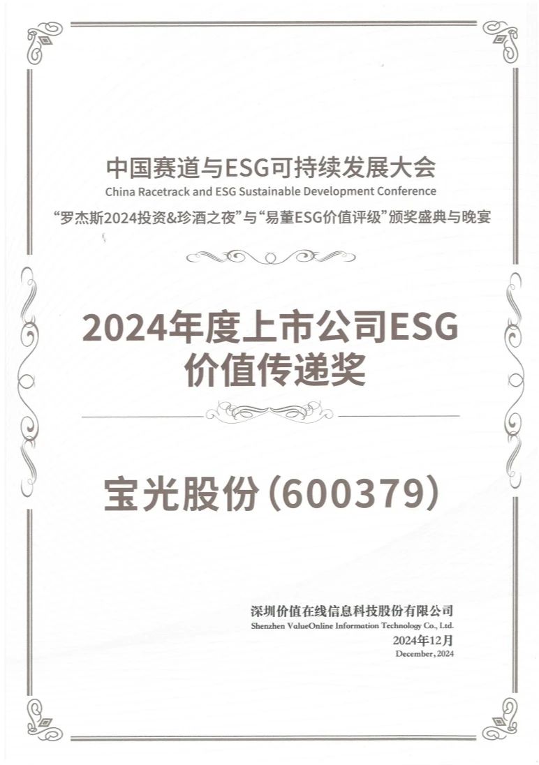 近日,寶光股份作為可持續(xù)發(fā)展理念的積極踐行者,喜獲“2024年上市公司可持續(xù)發(fā)展優(yōu)秀實(shí)踐案例名單”、“2024年第二屆國(guó)新杯·ESG金牛獎(jiǎng)科技引領(lǐng)二十強(qiáng)”、“2024年度上市公司ESG價(jià)值傳遞獎(jiǎng)”多項(xiàng)ESG大獎(jiǎng)。