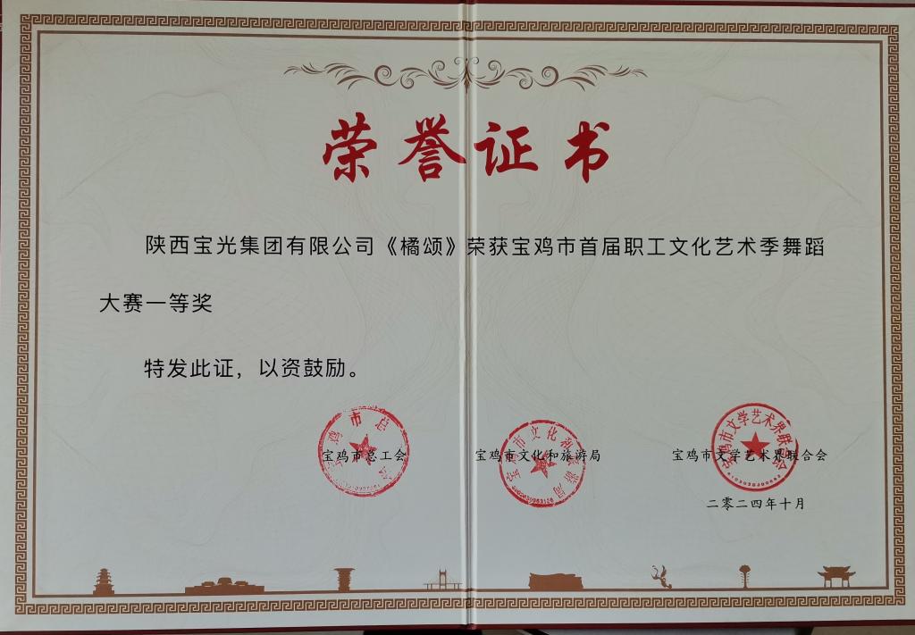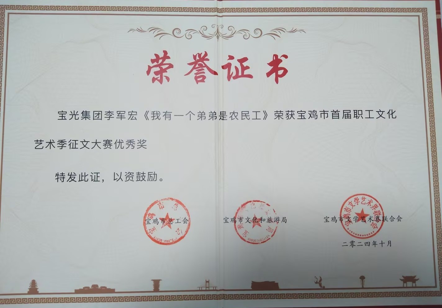 分別是:寶光集團榮獲寶雞市首屆職工文化藝術季優(yōu)秀組織獎、舞蹈《橘頌》榮獲寶雞市首屆職工文化藝術季舞蹈大賽一等獎、李軍宏的散文《我有一個弟弟是農民工》榮獲寶雞市首屆職工文化藝術季征文大賽優(yōu)秀獎。