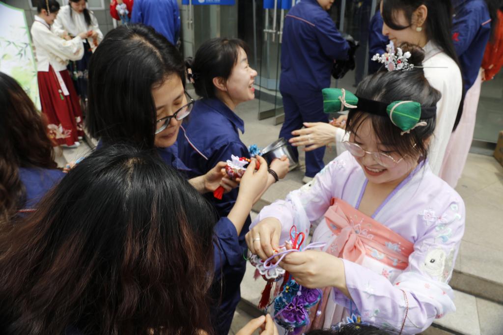 活動現(xiàn)場,別具一格的穿漢服發(fā)香包活動正在如火如荼地進行著。志愿者們身著華美的漢服,仿佛是穿越時空而來的古人,為職工們送上香包送去祝福和安康。漢服與香包的結(jié)合,不僅讓職工感受到了傳統(tǒng)文化的魅力,也讓人們在忙碌的工作中找到了一份寧靜和美好。